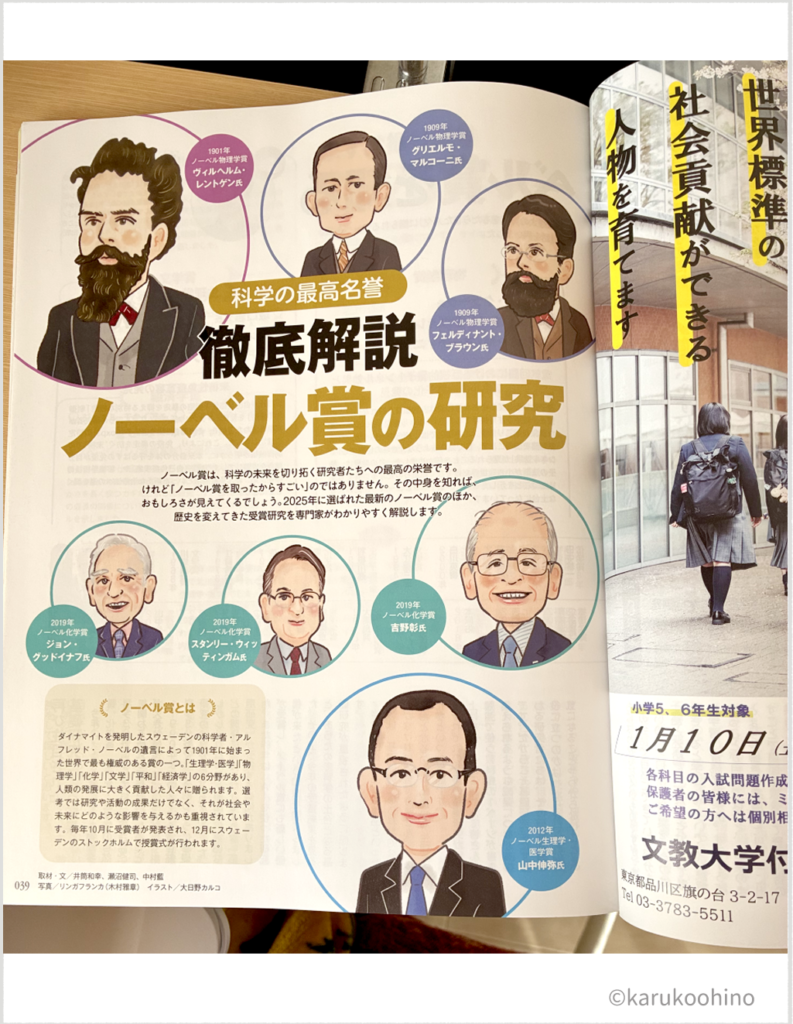 「ノーベル賞の研究」特集イラスト 2026 1/22 おしごと 教材・教養 似顔絵 書籍・雑誌 小学生向け教育情報誌「DreamNavi」2月号「ノーベル賞の研究」特集にてノーベル賞受賞者のイラストを描かせていただきました。 「リアル目デフォルメ・漫画タッチ・やわらかめ」のご要望でした。偉人の似顔絵を描くのが楽しかったです☺️ おしごと 教材・教養 似顔絵 書籍・雑誌 URLをコピーしました! 【連載】「合わせる靴がない!」スカートコーデ迷子を救った靴とは!?他 プロテイン広告マンガ
